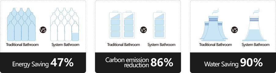 According to relevant statistics, the system bathroom save energy 47% more than traditional bathroom; emitting carbon dioxide 14% less; water saving 90 % more.