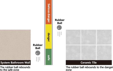 The same two rubber balls, roll along the track from the same height, and respectively hit the wallboards of system bathroom and tiles of traditional bathroom ; the longer the distance it rebounds mean the stronger bounce, and the higher degree of harm to the human body.